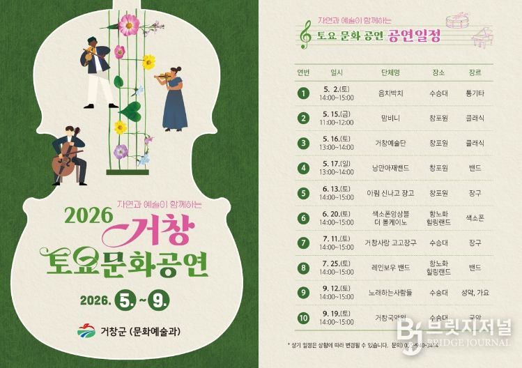 브릿지저널 김경미 기자 | 거창군이 주요 관광지를 무대로 군민과 관광객이 함께 즐길 수 있는 ‘2026 토요문화공연’을 본격 운영한다.
