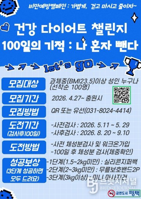 브릿지저널 김경미 기자 | 평택시는 시민들이 스스로 비만 관리 능력을 키우고 건강한 생활 습관을 정착시킬 수 있도록 돕는 비만 예방 프로그램 '100일의 기적’참가자를 모집한다고 밝혔다.