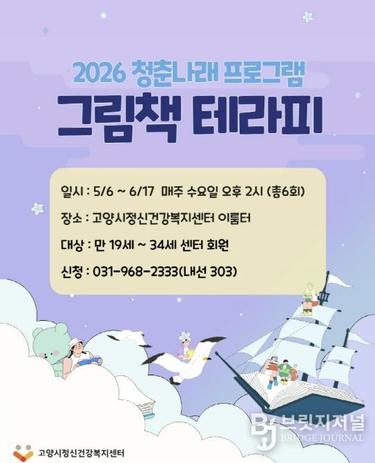 브릿지저널 김경미 기자 | 고양시정신건강복지센터는 청년들의 정서적 안정과 자기 이해를 돕기 위해 2026년 청춘나래 집단프로그램 ‘그림책 테라피’를 오는 5월 6일부터 운영한다.