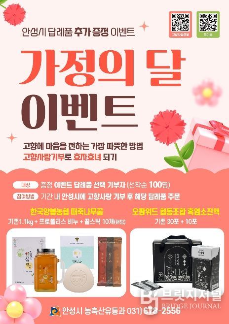 브릿지저널 김경미 기자 | 안성시는 오이데이와 5월 가정의 달을 맞아 고향사랑기부제 참여 확대와 지역 농산물 소비 촉진을 위해 ‘오이데이 이벤트’와 ‘가정의 달 이벤트’를 추진한다고 밝혔다.