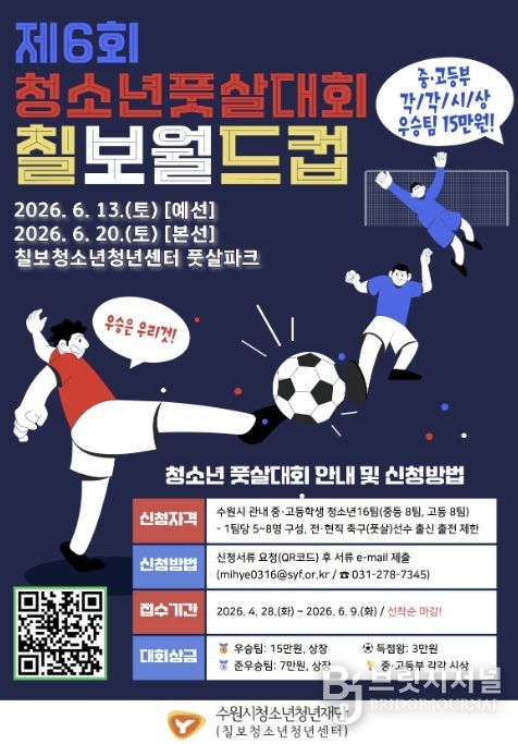 브릿지저널 김경미 기자 | 수원시청소년청년재단 칠보청소년청년센터는 오는 6월 13일(예선)과 20일(본선), 양일간 센터 내 풋살파크에서 녪. 청소년 풋살대회 [제6회 칠보월드컵]’을 개최한다고 밝혔다.
