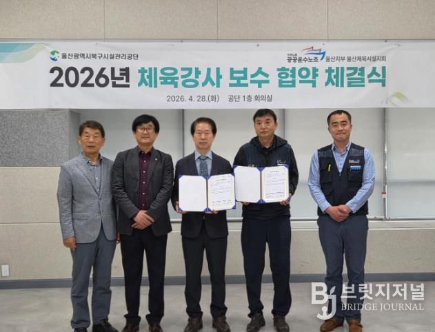 브릿지저널 윤나영 기자 | 울산광역시북구시설관리공단과 전국공공운수사회서비스노동조합 울산지부 울산체육시설지회는 28일 공단 1층 회의실에서 체육강사들의 처우 개선과 상생 협력을 위한 ‘2026년 체육강사 보수 협약 체결식’을 개최했다,