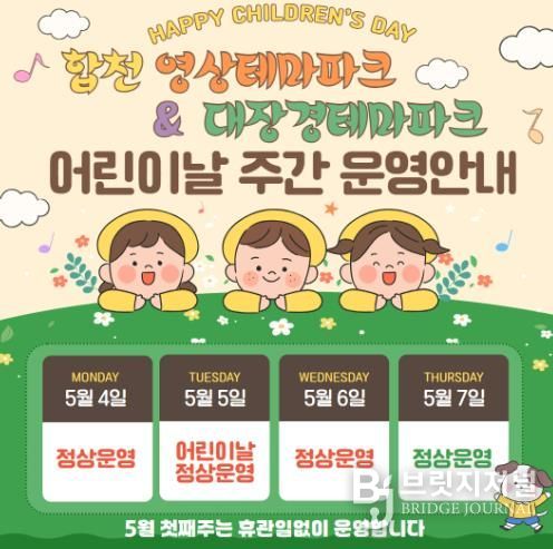 브릿지저널 김경미 기자 | 합천군은 5월 가정의 달을 맞아 5월 첫째 주(5.4.~5.6.)동안 합천영상테마파크와 대장경테마파크를 휴관일 없이 정상 운영한다고 28일 밝혔다.
