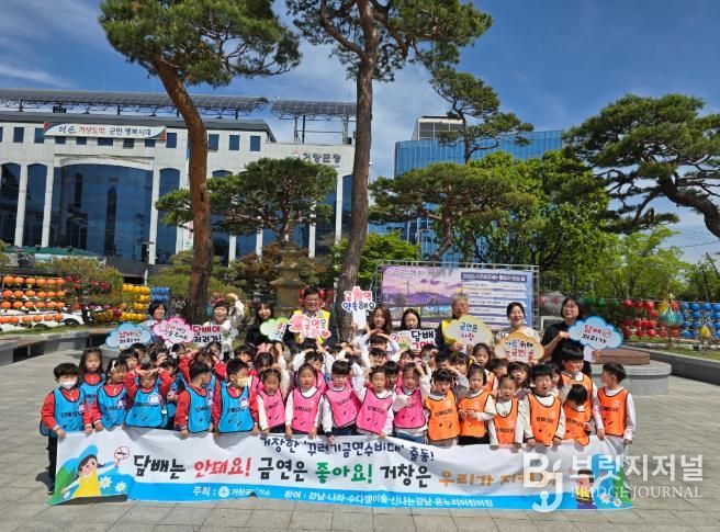 브릿지저널 김경미 기자 | 거창군 보건소는 28일 거창로타리에서 강남·나라·신나는강남어린이집 3개소 원아 60여 명이 참여해 ‘담배는 안돼요’를 주 슬로건으로 금연 캠페인을 펼쳤다.