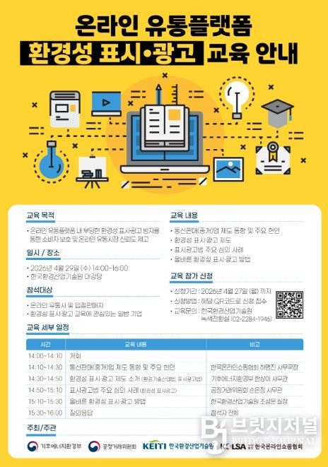 브릿지저널 김경미 기자 | 공정거래위원회와 기후에너지환경부는 4월 29일 한국환경산업기술원 대강당(서울 은평구 소재)에서 온라인 유통사를 대상으로 ‘환경성 표시·광고 교육’을 개최한다고 밝혔다.