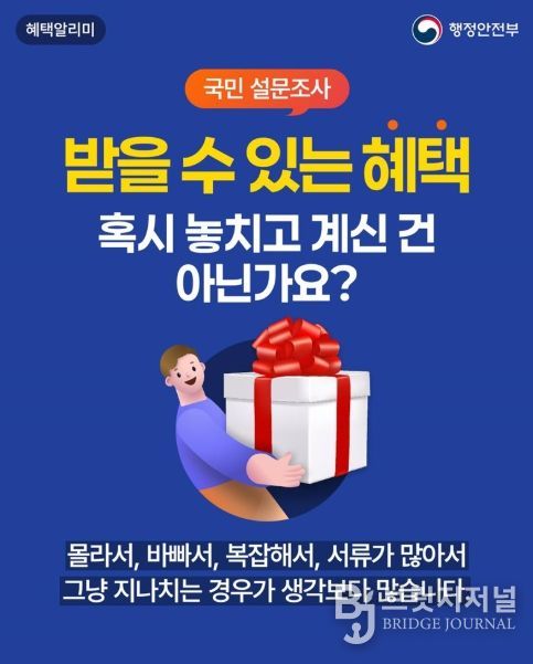행정안전부 혜택알리미는 내가 받을 수 있는 혜택을 직접 찾지 않아도 먼저 확인해서 알려드리는 서비스입니다.