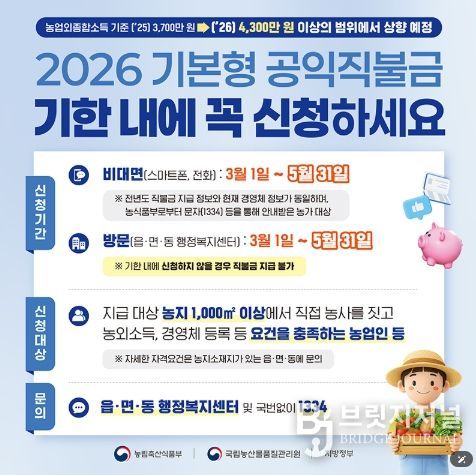 브릿지저널 김경미 기자 | 2026 기본형 공익직불금 기한 내에 꼭 신청하세요.
