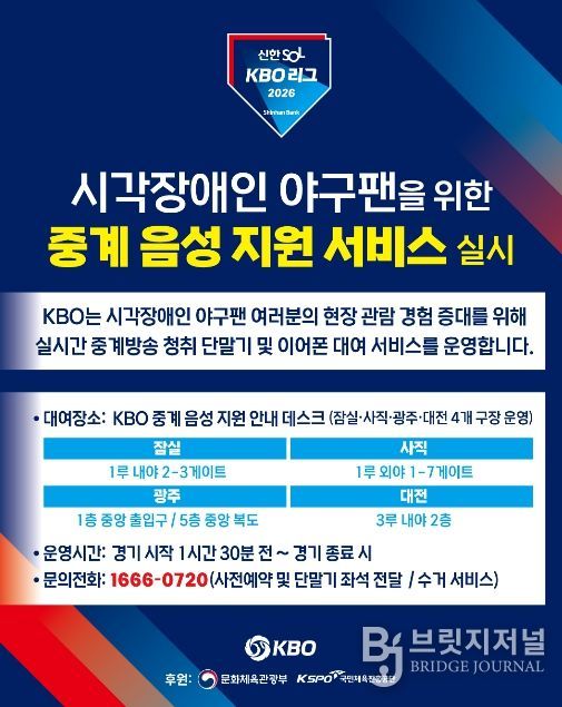 브릿지저널 김경미 기자 | KBO는 2023년부터 잠실, 사직, 광주 구장에서 운영해 온 ‘KBO 리그 시각장애인 현장 관람객 대상 중계 음성 지원 서비스’를 올해 대전 한화생명 볼파크까지 확대해 총 4개 구장에서 운영한다.