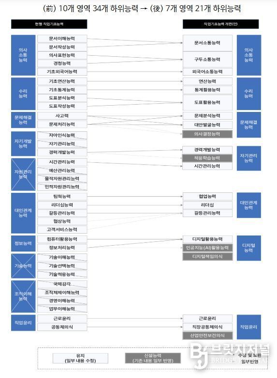 브릿지저널 정보영 기자 | 고용노동부는 직업기초능력을'직업공통능력'으로 명칭을 변경하고, 미래 핵심 역량을 포함한 7개 영역으로 전면 개편한다.