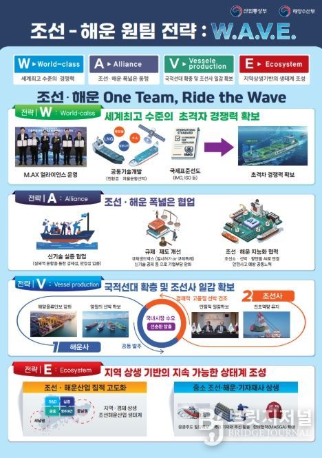 W.A.V.E. 전략은 ❶‘W(World Top Class)’ : 세계 최고 수준의 초격차 기술을 확보하고, ❷‘A(Alliance)’ : 조선・해운 전반에 폭넓은 산업연계 동맹을 구성하고, ❸’V(Vessel production)’ : 국적 선대 확충과 국내조선사 일감 확보로, ❹‘E(Ecosystem)’ : 지역경제 기반의 상생혁신 생태계를 구축한다는 조선-해운 상생발전의 비전을 의미한다.
