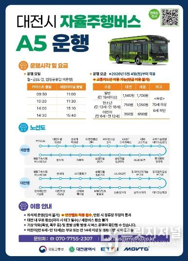 브릿지저널 정보영 기자 | 대전시는 충청권 자율주행 시범운행지구에서 무료로 운영 중인 자율주행버스 A5 노선을 5월 4일부터 유상운송 서비스로 전환한다고 밝혔다.
