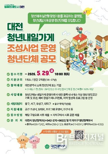 브릿지저널 정보영 기자 | 대전시는 청년이 지역에서 창업을 직접 경험하고 성장할 수 있는 ‘청년내일가게 조성사업’ 운영단체를 5월 29일까지 공개 모집한다.