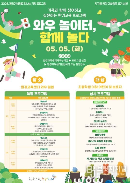 브릿지저널 김경미 기자 | 충청북도교육청 환경교육센터와우는 어린이날을 맞아 5월 5일 오전 10시부터 오후 4시 50분까지 센터 일원에서 '와우놀이터, 함께 놀다' 프로그램을 운영한다고 밝혔다.