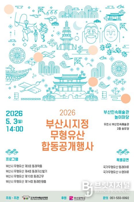 브릿지저널 윤나영 기자 | 부산시는 오는 5월 3일 오후 2시 부산시 무형유산 전수교육관인 '부산민속예술관 놀이마당'에서 무형유산의 보존과 원형 전승을 위한 '2026 부산광역시 지정 무형유산 합동 공개행사'를 개최한다고 밝혔다.