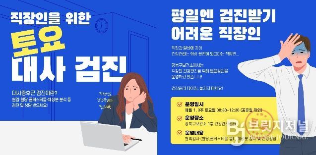 브릿지저널 김경미 기자 | 서울 강북구 보건소 건강관리센터가 평일에 시간을 내기 어려운 직장인들의 건강 회복을 위해 ‘직장인 맞춤형 토요 대사증후군 검진 서비스’를 운영하며 구민 건강권 확보에 나섰다.