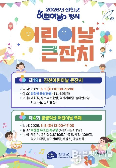 브릿지저널 김경미 기자 | 충북 진천군은 제104회 어린이날을 맞아 5월 5일 진천읍 화랑공원과 덕산읍 유소년축구장 두 곳에서 어린이날 기념행사를 개최한다고 밝혔다.