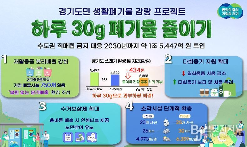 브릿지저널 김경미 기자 | 수도권 직매립 금지에 따른 생활쓰레기 감량을 위해 경기도가 2030년까지 5년간 약 1조 5,447억 원을 투입하는 ‘하루 30g, 도민실천형 생활폐기물 감량 프로젝트’를 추진한다.