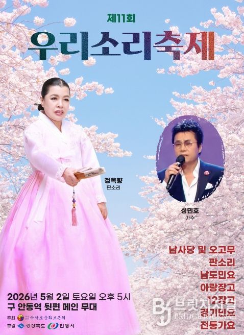 브릿지저널 정보영 기자 | 사단법인 국악로문화보존회가 주최․주관하는 '제11회 우리소리 축제'가 오는 5월 2일 오후 5시 안동 탈춤공원 무대에서 개최된다.
