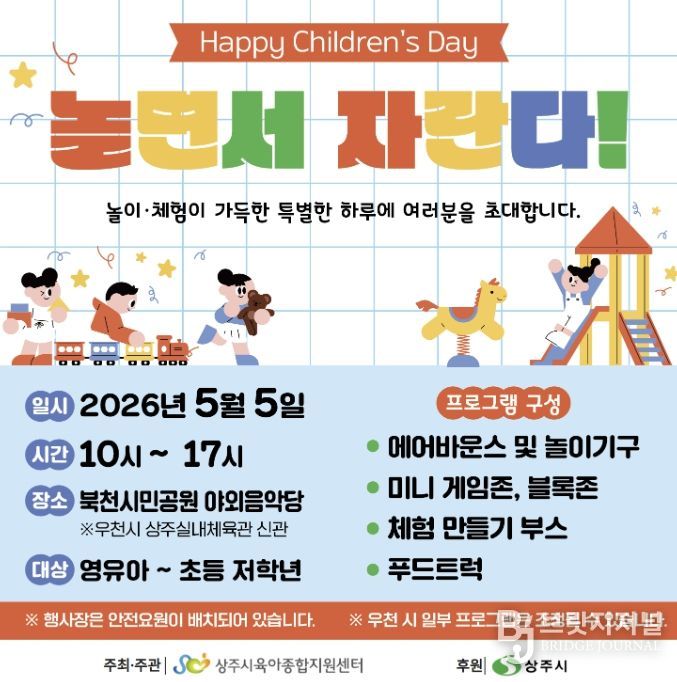 브릿지저널 정보영 기자 | 상주시는 제104회 어린이날을 맞아 오는 5월 5일 북천시민공원 야외음악당에서 ‘Happy Children`s Day – 놀면서 자란다!’를 주제로 어린이날 기념행사를 개최한다.