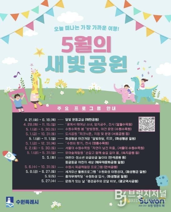 브릿지저널 김경미 기자 | 수원특례시는 5월 한 달간 도시공원과 수목원, 수원화성 일원에서 시민 참여형 자연·문화·체험 프로그램을 운영한다. 가정의 달을 맞아 가족 단위로 공원에서 여가와 체험을 함께 즐길 수 있도록 프로그램을 확대했다.