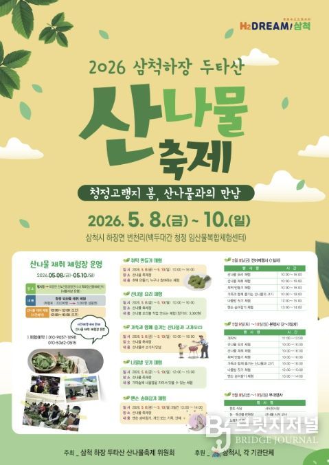브릿지저널 윤나영 기자 | 삼척시는 2026년 제13회 ‘삼척 하장 두타산 산나물 축제’가 5월 8일부터 10일까지 백두대간 청정임산물 복합체험센터(삼척시 하장면 두타로 499) 일원에서 개최된다고 밝혔다.