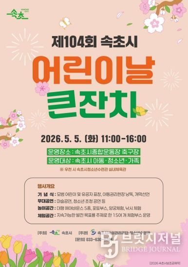 브릿지저널 윤나영 기자 | 속초시는 어린이날을 맞아 5월 5일 오전 11시부터 오후 4시까지 속초시종합경기장 인조잔디축구장에서 ‘제104회 속초시 어린이날 큰잔치’를 연다. 우천 시에는 청소년수련관 실내체육관에서 진행한다.