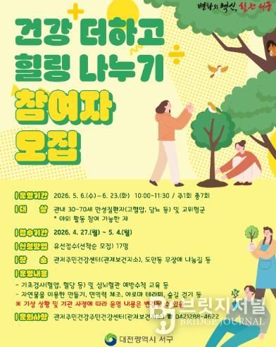 브릿지저널 정보영 기자 | 대전 서구는 만성질환을 앓는 주민들의 심리적 안정과 삶의 질 향상을 위한 ‘건강 더하고(+) 힐링 나누기(÷)’ 프로그램 참여자를 모집한다.