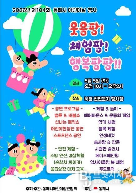 브릿지저널 윤나영 기자 | 동해시는 어린이들이 안전하고 행복한 환경 속에서 마음껏 꿈을 키울 수 있도록 오는 5월 5일 전천 일원에서 어린이날 기념행사를 개최한다고 밝혔다.