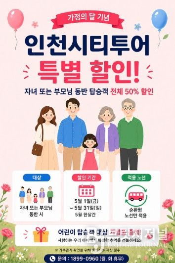 브릿지저널 김경미 기자 | 인천관광공사는 5월 가정의 달을 맞아 가족 단위 관광객 유입을 확대하고 이용객의 재방문 활성화를 위한‘인천시티투어 특별 프로모션’을 실시한다고 밝혔다