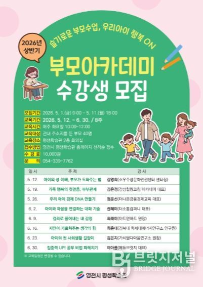 브릿지저널 정보영 기자 | 영천시 평생학습관은 5월 1일부터 11일까지 ‘2026년 상반기 부모아카데미’ 수강생을 모집한다.