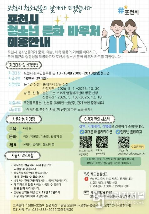 브릿지저널 김경미 기자 | 포천시는 청소년의 문화 접근성을 높이고 다양한 체험 기회를 제공하기 위해 ‘포천시 청소년 문화 바우처 지원사업’을 본격 시행한다.