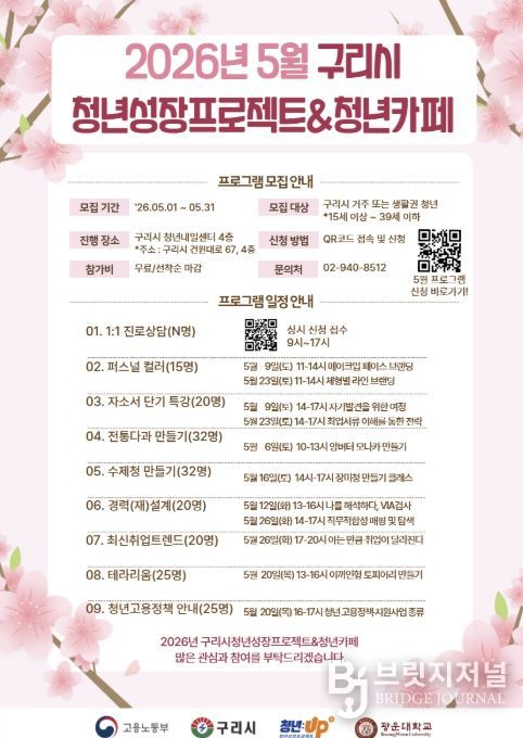 브릿지저널 김경미 기자 | 구리시는 2026년 5월 한 달간 구리시 청년내일센터에서 운영되는 '청년성장프로젝트' 참여자를 모집한다고 밝혔다.