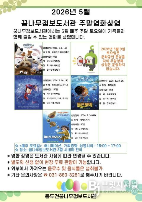 브릿지저널 김경미 기자 | 동두천시 도서문화사업소 정보도서관에서는 오는 5월 매주 토요일 어린이와 가족을 위한 애니매이션 및 가족영화 4편을 상영한다고 밝혔다.