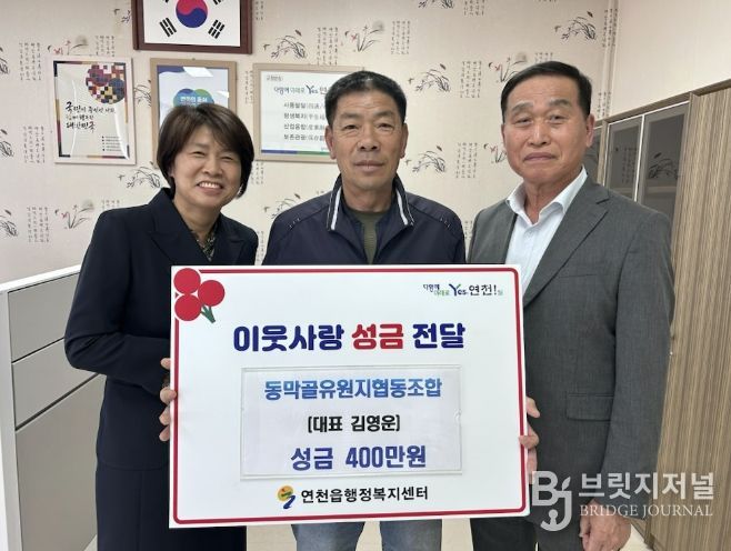브릿지저널 김경미 기자 | 동막골유원지협동조합은 지난 28일 오후 4시 연천읍행정복지센터 읍장실에서 이웃돕기 후원 성금 400만 원을 기탁했다.
