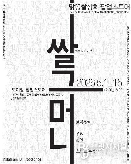 전주 남부시장 백년시장 육성사업단은 오는 5월 1일부터 15일까지 전주 남부시장 모이장 팝업스토어존에서 토종쌀 팝업스토어인 ‘쌀그머니–토종쌀이 우리 삶에 스며드는 방식’을 운영한다.