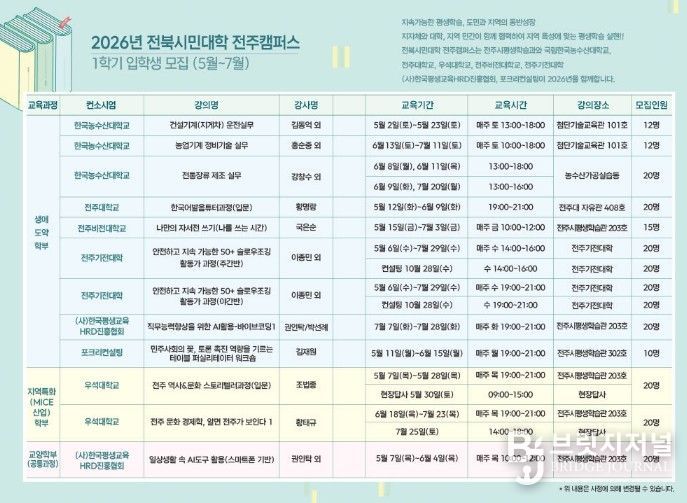 브릿지저널 윤나영 기자 | 전주시는 지역 밀착형 평생학습 체계를 구축하고, 시민들의 지속가능한 자기 계발을 돕기 위한 ‘2026년 전북시민대학 전주캠퍼스’에 참여할 1학기 신입생을 모집한다고 29일 밝혔다.