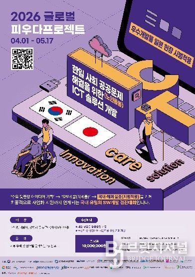 먼저 오는 5월 17일 접수를 마감하는 ‘2026 글로벌 피우다 프로젝트’는 과학기술정보통신부가 주최하고 정보통신산업진흥원과 전국 ICT 콤플렉스 운영기관이 공동 주관하는 글로벌 SW 개발 경진대회로, 한국과 일본의 사회문제(노인돌봄) 해결을 위한 ICT 솔루션 개발을 목표로 아이디어 기획부터 시제품 개발, 국내외 실증까지 전 과정을 지원한다.