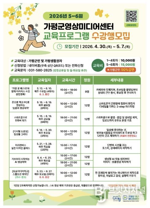 브릿지저널 김경미 기자 | 가평군영상미디어센터가 군민들의 영상 미디어 콘텐츠 역량 강화를 위해 ‘5~6월 미디어 교육 프로그램’ 수강생을 4월 30일부터 선착순으로 모집한다.