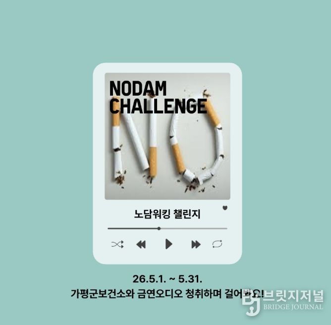 브릿지저널 김경미 기자 | 가평군보건소가 ‘세계 금연의 날’을 앞두고 5월 1일부터 한 달간 금연 인식 확산을 위한 ‘노담워킹 챌린지’를 진행한다. 이번 행사는 일상 속 걷기 실천과 금연 홍보를 병행해 군민들의 건강한 생활 습관 형성을 돕고자 마련됐다.