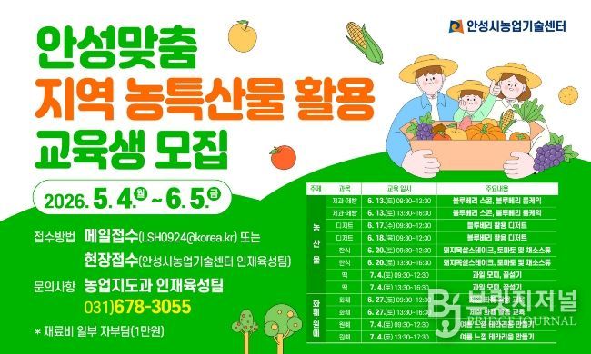 브릿지저널 김경미 기자 | 안성시농업기술센터는 지역 농산물을 활용한 실습 교육을 통해 소비를 촉진하고 ‘지산지소(지역에서 생산된 농산물을 지역에서 소비함)’ 문화를 활성화하고자, 오는 5월 4일부터 6월 5일까지 교육생을 모집한다고 밝혔다.