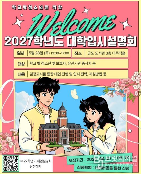브릿지저널 김경미 기자 | 안성시학교밖청소년지원센터는 학교 밖 청소년의 성공적인 진학을 돕기 위해 오는 5월 28일 오후 1시 30분부터 공도 도서관 다목적홀에서 ‘2027학년도 대학 입시 설명회’를 개최한다고 밝혔다.