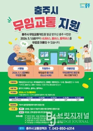 브릿지저널 김경미 기자 | 충주시가 교통약자의 이동 편의를 높이고 사회활동 참여를 독려하기 위해 오는 5월 1일부터 ‘충주시 어르신 등 무임교통 지원 사업’을 전격 시행한다고 밝혔다.