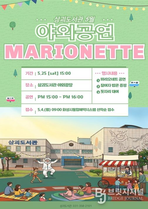브릿지저널 김경미 기자 | 화성시립 삼괴도서관은 5월 가정의 달을 맞아 오는 5월 23일, 도서관 야외광장에서 가족 단위 이용자를 위한 특별한 문화행사를 운영한다. 따뜻한 봄날의 야외 공간에서 누구나 편안하게 즐길 수 있도록 마련된 이번 행사는 도서관을 찾는 시민들에게 색다른 문화 경험과 여유로운 시간을 제공할 예정이다.
