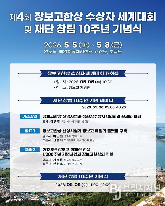 브릿지저널 김경미 기자 | 사단법인 장보고글로벌재단(이사장 김덕룡)이 창립 10주년 기념식 및 제4회 장보고한상 수상자 세계대회를 5월 5일부터 8일까지 완도에서 개최한다고 밝혔다.