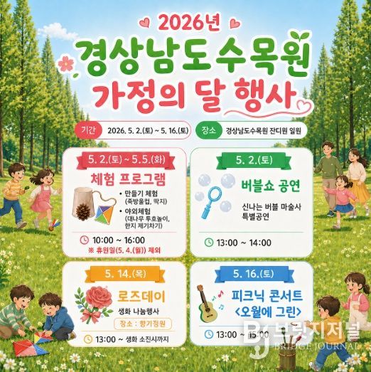 브릿지저널 김경미 기자 | 경상남도산림환경연구원은 가정의 달 5월을 맞아 오는 5월 2일부터 16일까지 경상남도수목원 잔디원 일원에서 가족 단위 방문객을 위한 체험·공연·나눔 행사를 운영한다고 밝혔다.