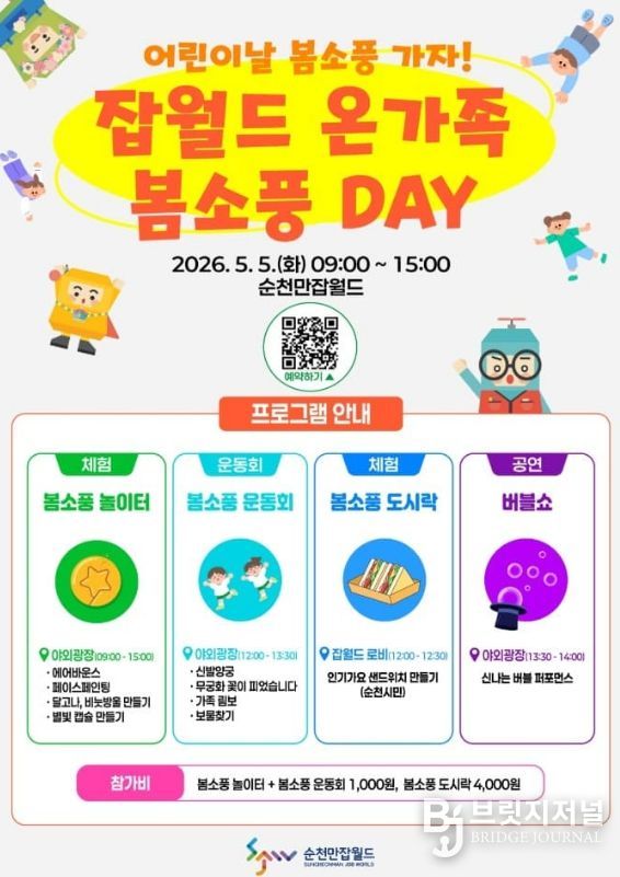 브릿지저널 김경미 기자 | 순천시는 오는 어린이날을 맞아 순천만잡월드에서 ‘잡월드 온가족 봄소풍 DAY’이벤트를 개최한다고 밝혔다.