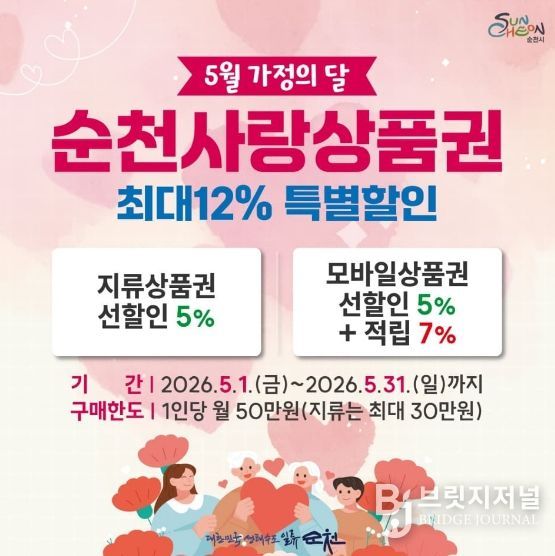브릿지저널 김경미 기자 | 순천시가 5월 한 달간 순천사랑상품권 특별 할인행사를 추진해 시민들의 가계 부담을 덜고 지역 소상공인에게 활력을 불어넣는 소비 촉진에 나선다.