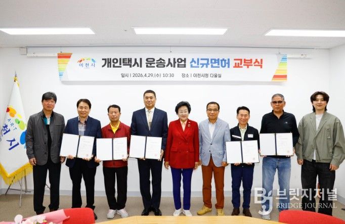브릿지저널 김경미 기자 | 이천시는 29일 시청 다올실에서 개인택시운송사업 신규 면허증 교부식을 개최하고, 심사를 통해 최종 선정된 5명의 대상자에게 면허증을 전달했다고 밝혔다.