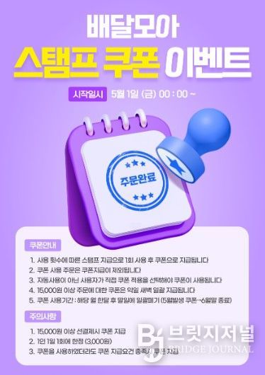 브릿지저널 김경미 기자 | 제천시는 공공배달앱 ‘배달모아’ 이용 고객을 대상으로 5월 1일부터 ‘스탬프 쿠폰 이벤트’를 진행한다.