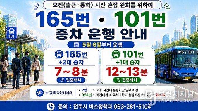 시는 101번 노선의 오전 7시 40분과 8시 5분 출발 차량 사이인 7시 52분 출발 차량을 투입해 기존 25분의 배차간격을 12~13분 수준으로 단축키로 했다. 이를 통해 학생들의 등교 편의를 높이고, 승객을 분산시켜 안전하고 쾌적한 시내버스 이용 환경을 조성한다는 구상이다.
